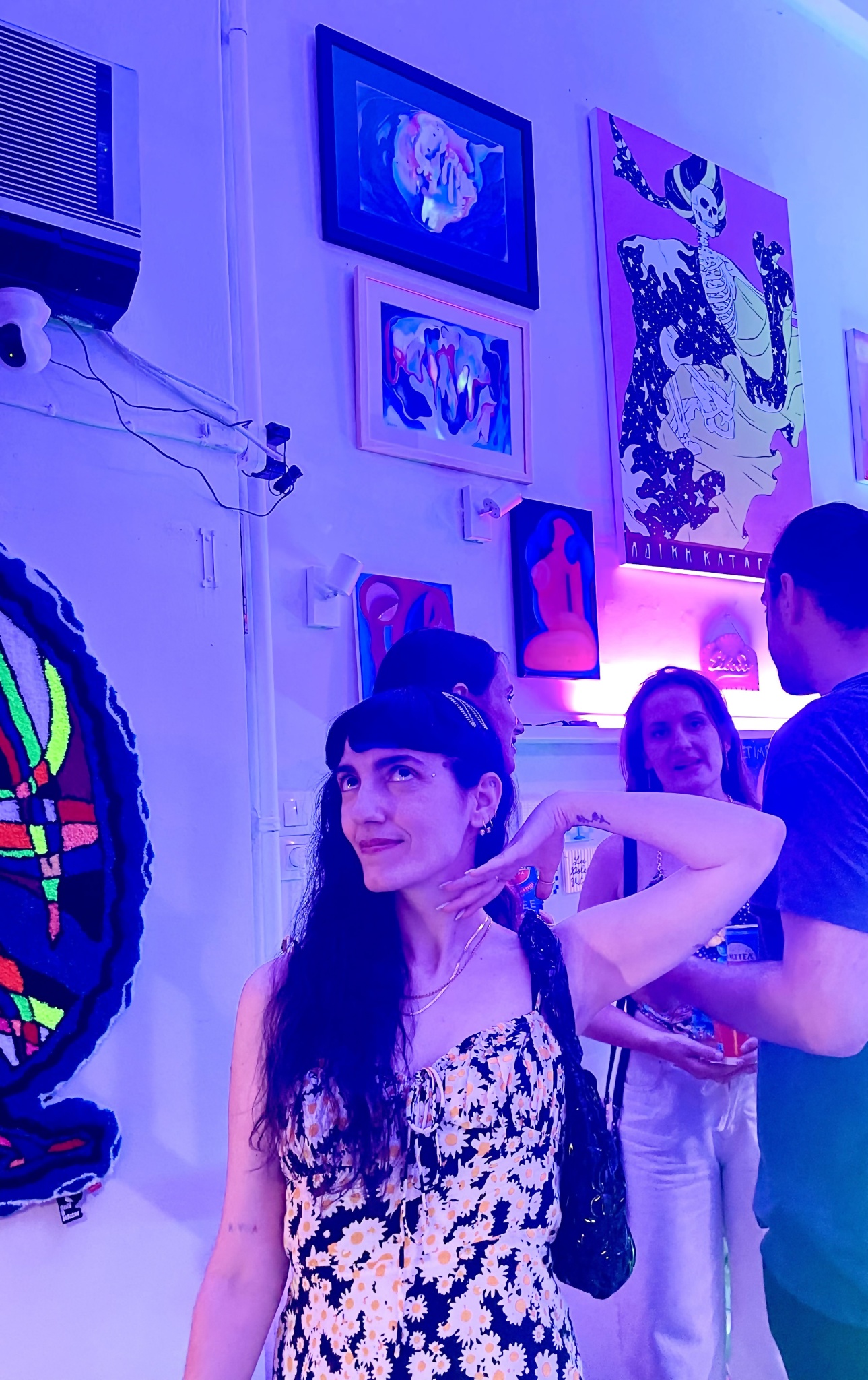 This is my piece Small hours / 47cm x 39cm (framed) / Colour pencil, water colour and Indian ink on paper / which I exhibited at the group show for the celebration of the two years of the Artworld gallery / 2025 / Artworld / Athens / Greece